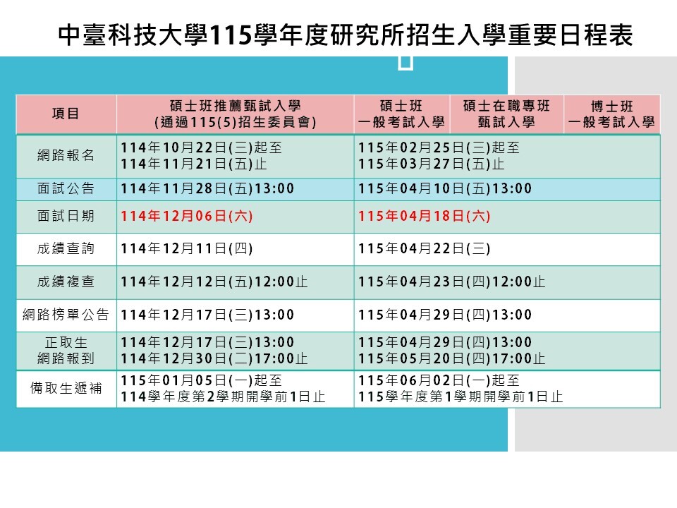 115學年度研究所【推薦甄試/一般考試/碩士在職專班】招生日程